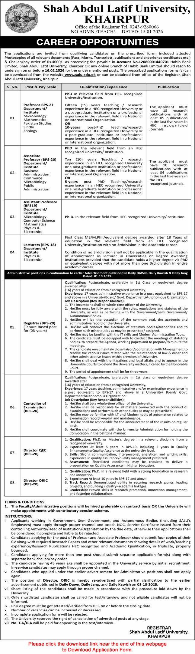 Shah Abdul Latif University Khairpur Jobs 2026 SALU Application Form Teaching Faculty & Others